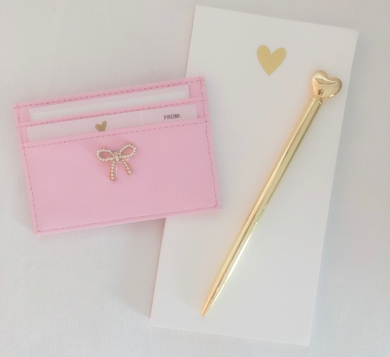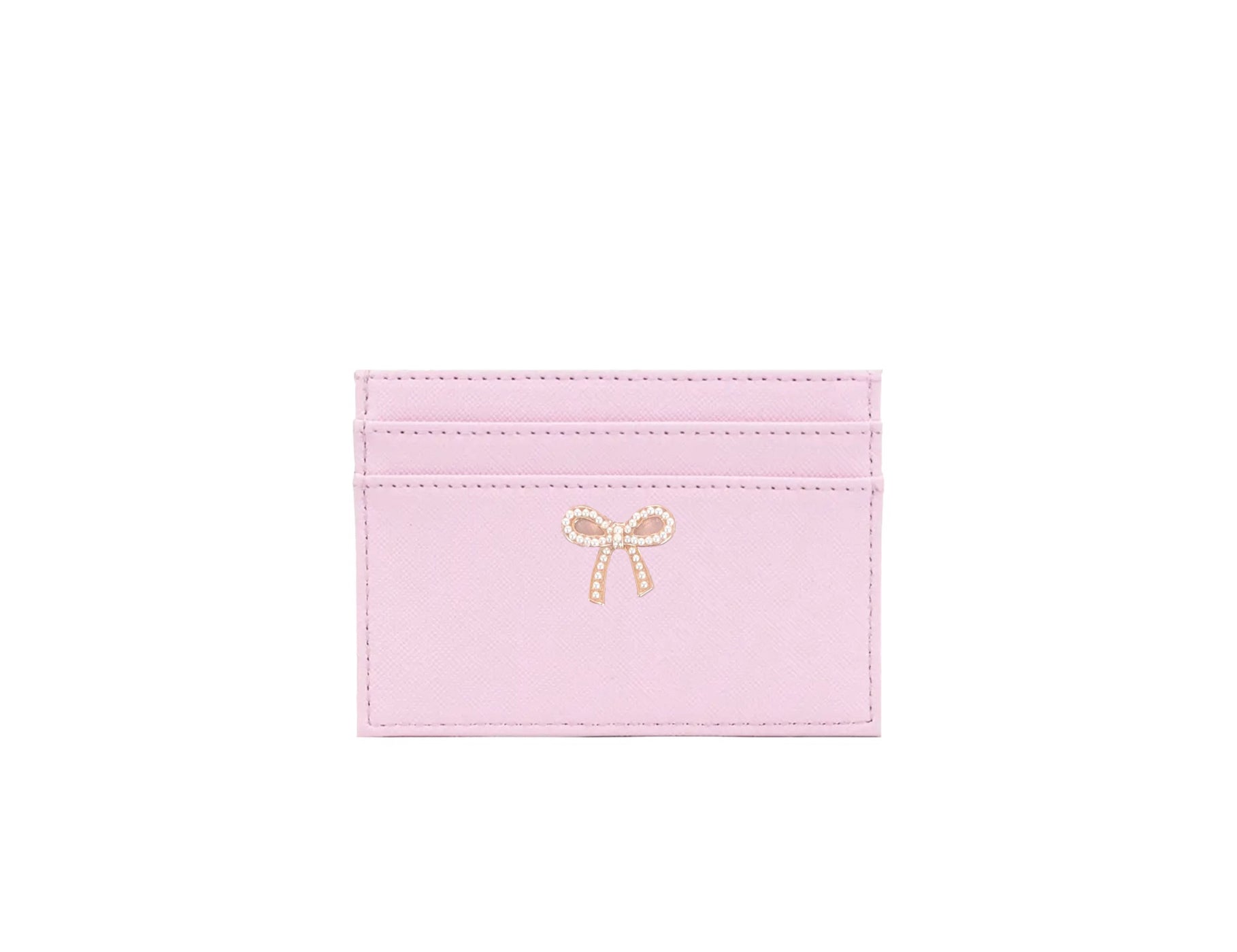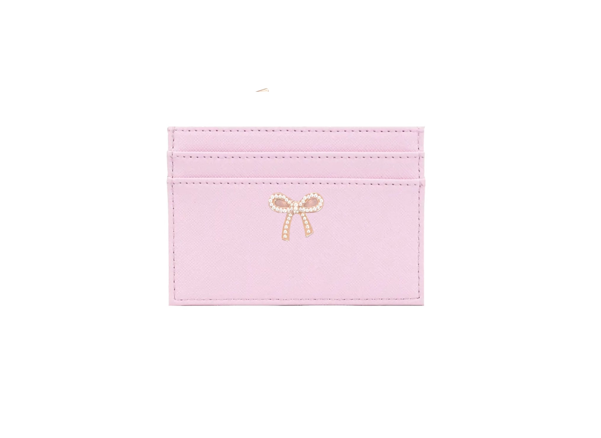Our Bestselling card holder is restocked! Made from beautiful pink vegan saffiano leather, our bow card holder is the perfect accessory to hold all of your cards and information. Gold and pearl bow applique. Looks great paired with our Luxury pink quilted bag. Final sale.