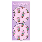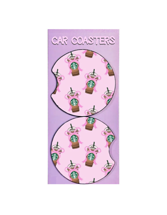 Cute pink frap coffee car coasters. 1 set of two neoprene fabric coasters. Universal fit for most vehicles- 2.75in. These are washable!
