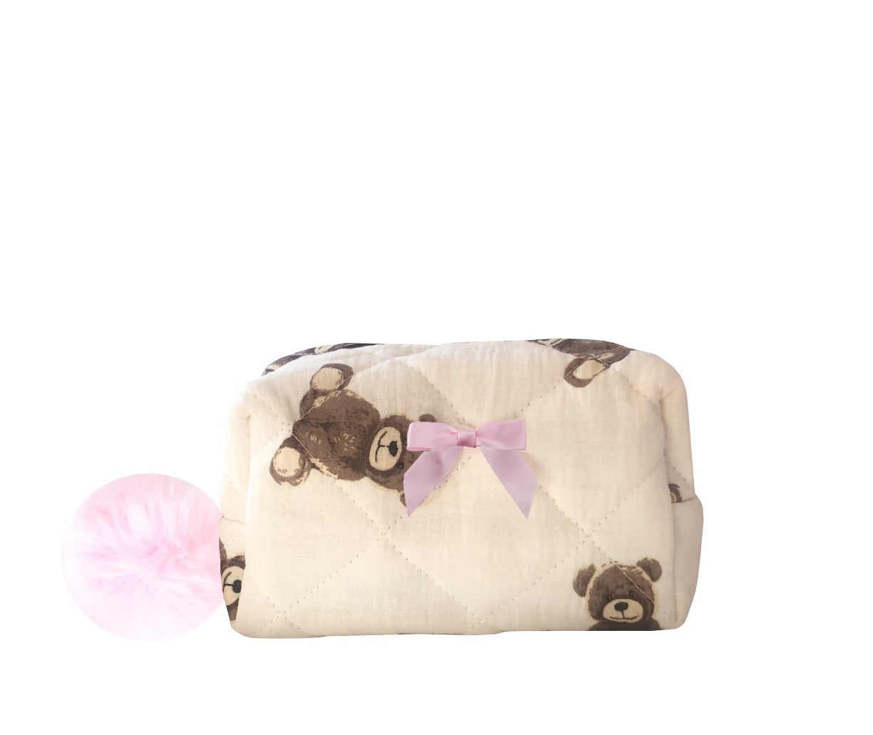 Our cute quilted teddy bear pouch features a pink bow and a removeable faux pink pom charm. Pouch is the perfect size to hold all of your essentials. Cotton checked lining. Zipper closure.